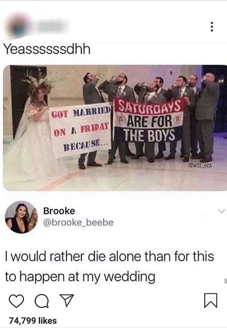 4) “Je vraagt je waarschijnlijk af waarom onderstaande foto tenenkrommend is? Nou, dan is het waarschijnlijk goed om te weten dat zij NIET de bruid was.”