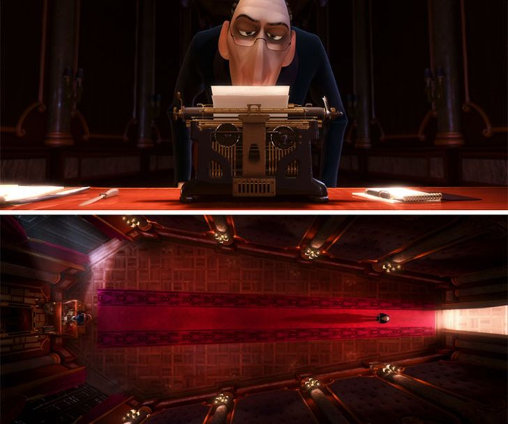 4) De typemachine van Anton Ego is in de vorm van een doodshoofd. Zijn kantoor heeft de vorm van een doodskist.