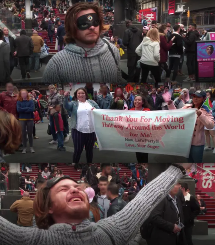8) Toen Syngin door Tania verrast werd met een banner op Times Square