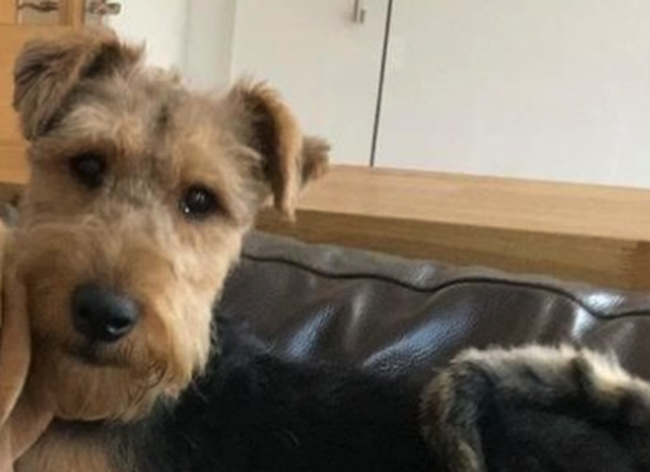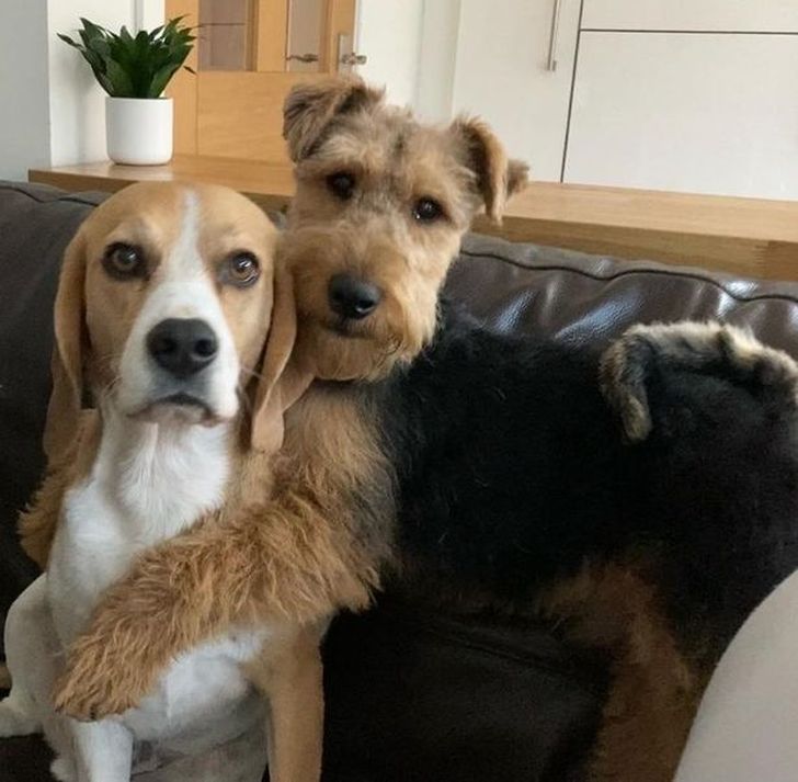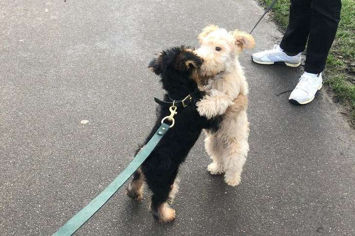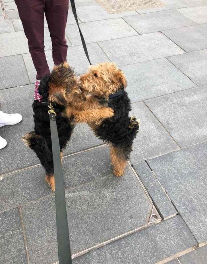 De zeven-maand oude Welsh Terrier vouwt zijn pootjes om medehonden heen voor een liefhebbende knuffel