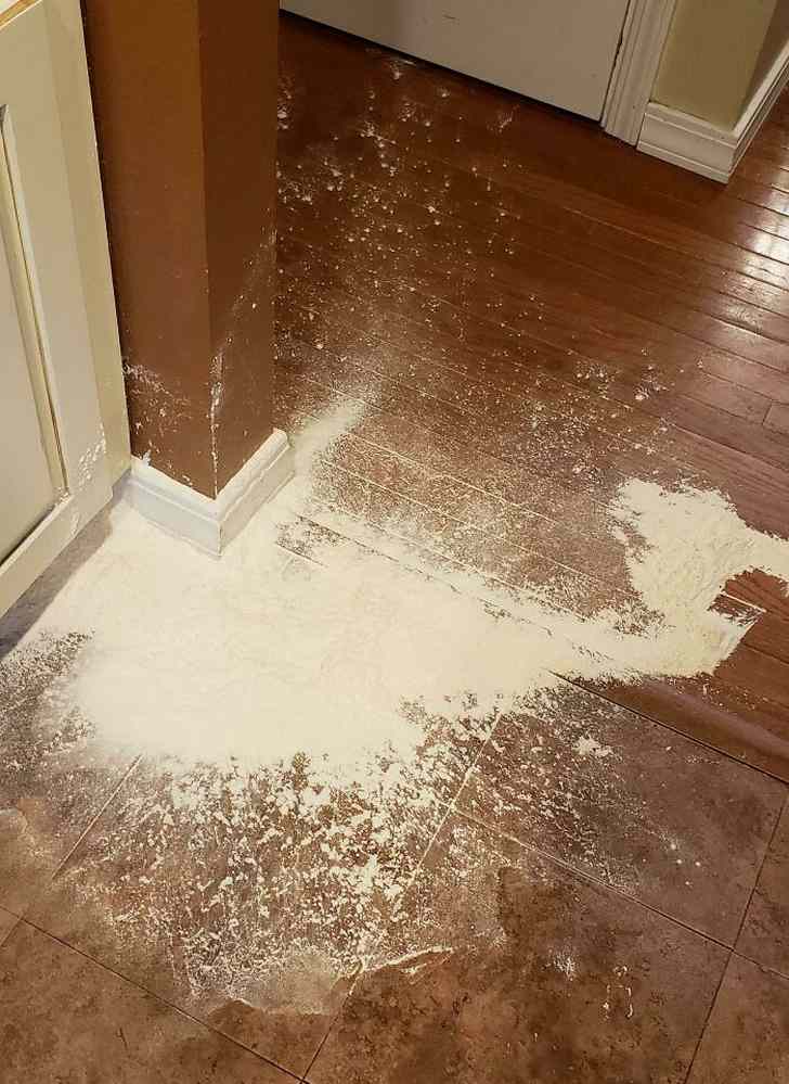 9) "Ik had de bloem aan de kant gezet zodat mijn kind geen rommel zou maken, maar toen gooide ik hem zelf van het aanrecht met m'n elleboog."