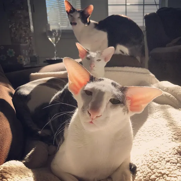 Teddy, Stache en Bindi behoren allemaal tot hetzelfde kattenras: de Oosterse korthaar. Dat is ook waarom hun oortjes zo zijn gegroeid. Naar het oosten. Oké flauw, maar lief is het wel!  | bron: instagram.com