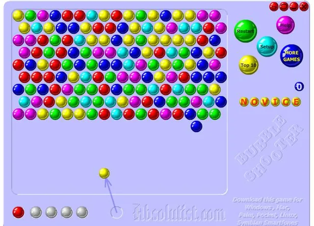 Bubble Shooter had eigenlijk wel iets weg van Tetris, vooral als het aankwam op irritantheid. Je kon al zien welk bolletje er bijna aankwam, maar dit was NOOIT het bolletje waar je op wachtte. | bron: bubbleshooter2.co