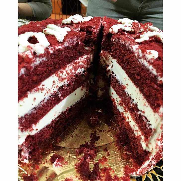 2) De perfecte Red Velvet-cake is vuurrood en besmeerd met honderd lagen frosting
