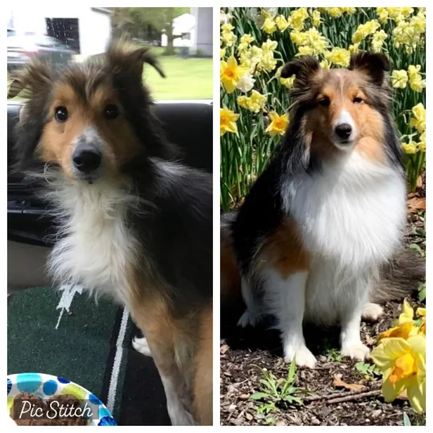 Chromie werd drie maanden geleden door de huidige eigenaren uit het asiel geadopteerd. Drie maand later ziet hij eruit zoals op de rechter foto. Een gelukkige GoodBoy.