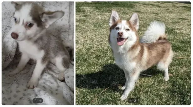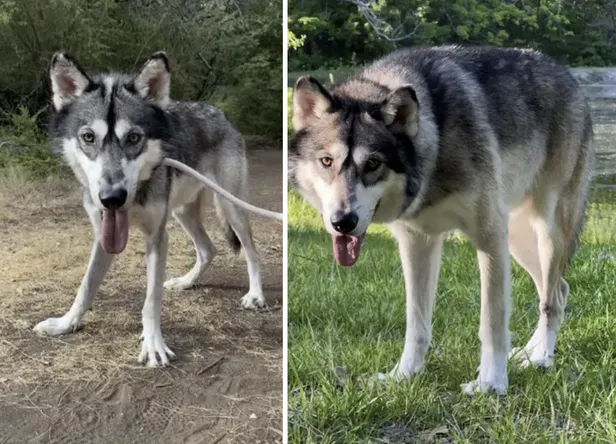Kenai op de tweede dag bij z'n nieuwe baasjes versus ongeveer een maand geleden. Een prachtige, gezonde wolf. Eh, hond.