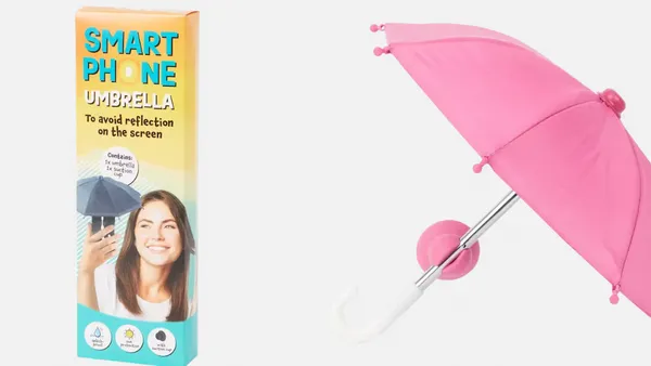 Bedank ons later maar. We houden van ijs. Het parapluutje wordt trouwens door middel van een zuignapje aan de achterkant van je telefoon bevestigd en de paraplu doet vervolgens z'n werk. Hij blokkeert het directe zonlicht op je scherm, dus je hebt nooit meer last van die spiegeling van de de zon. En het ziet er ook nog eens hartstikke gezellig uit. De paraplu is verkrijgbaar in de kleuren: grijs, zwart, blauw, roze en geel.