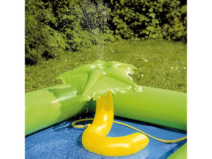 En dat is nog niet alles: er zit ook nog een sproeier-palmboom op én een glijbaan: hoe vet