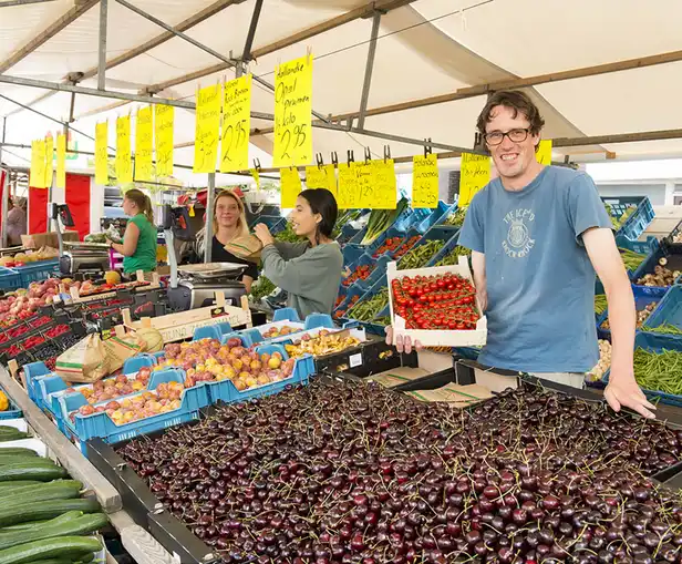 "Mijn favoriete standje is die op weekmarkt hier van Gerrit. Hij heeft heerlijke pruimen. Z'n tomaatjes zijn ook lekker sappig. Of wat te denken van z'n kersen, heerlijk gewoon! Het water loopt me alweer in de mond.."
