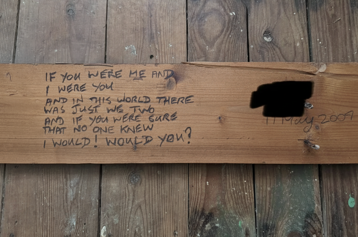 Op het briefje stond de datum 11 mei 2007 en daaronder één cryptische zin: “Si tu étais moi et que j’étais toi…” oftewel “Als jij mij was, en ik jou…”. Daarna stopte het. Geen naam, geen uitleg, geen context. Alsof iemand bewust de rest van de zin heeft weggelaten. Die onafgemaakte gedachte maakt het briefje juist intrigerend. Je ziet bijna voor je hoe iemand even twijfelde, de pen neerzette en het papiertje vervolgens achter de plint verborg.